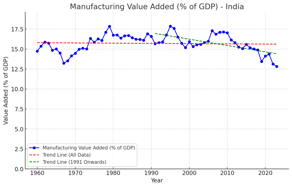 Opinions differ about whether manufacturing can (and will) continue to play the starring role it has in the past. But it remains a variable of crucial importance, and India is not well served by having manufacturing remain at around 10%-15% of GDP.