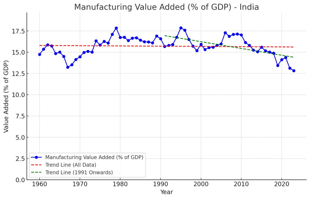 Because the empirical data tells us that if we want India's per capita GDP to go up over time, we should be increasing the share of manufacturing in GDP.