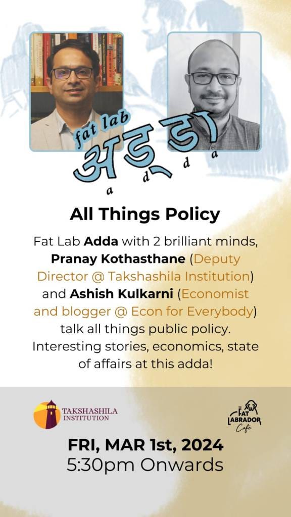 The Fat Labrador serves excellent coffee, and at least one of the two people conversing tomorrow is always worth listening to. The other is hoping to learn as much as you are, so if you can spare the time, please join me in learning from one of India's best public policy analysts.