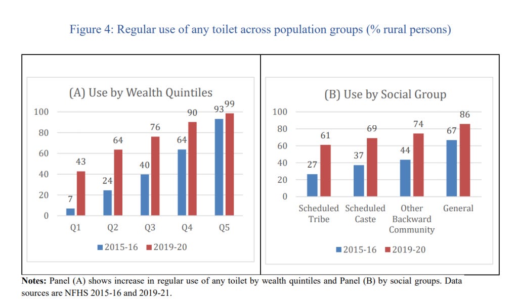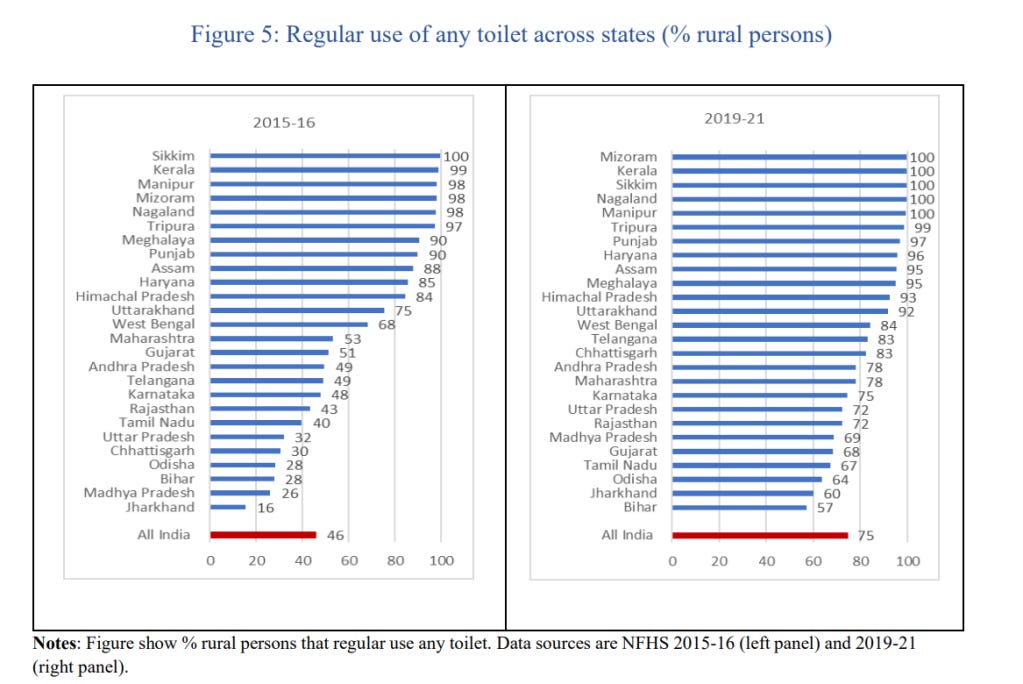 Second, the improvement in regular toilet use is encouraging, and the biggest improvements come from the poorest states, and the most disadvantaged communities: