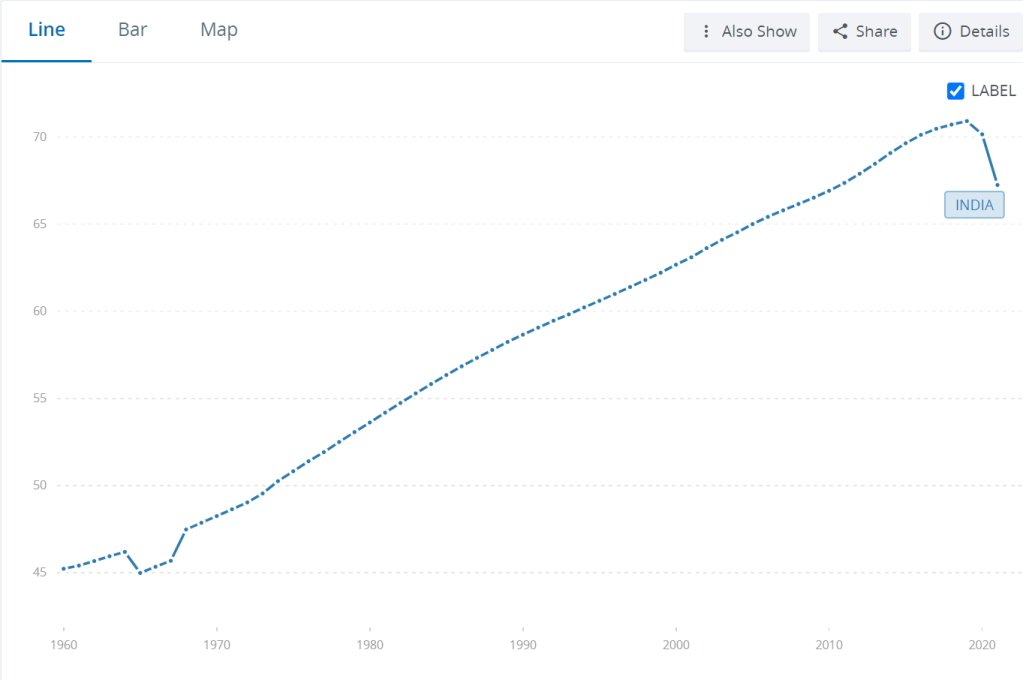 For example, here's a chart from the World Bank, showing India's life expectancy at birth in years: