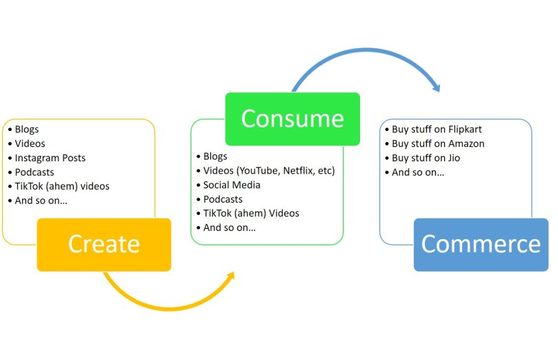 Let's begin with the one in the middle. When you're lying on your sofa at three in the morning, flicking through Netflix's endless library of content, you are very much a consumer. When you roll your eyes at the latest dripping-with-insanity forward you receive on your family Whatsapp group, you are a consumer of content online. When you run a search for a PDF that will help you finish an assignment in college: consumer. For most of us, the internet enables us to consume stuff at levels that have never before been possible. Music, videos, podcasts, the written word: all consumption.