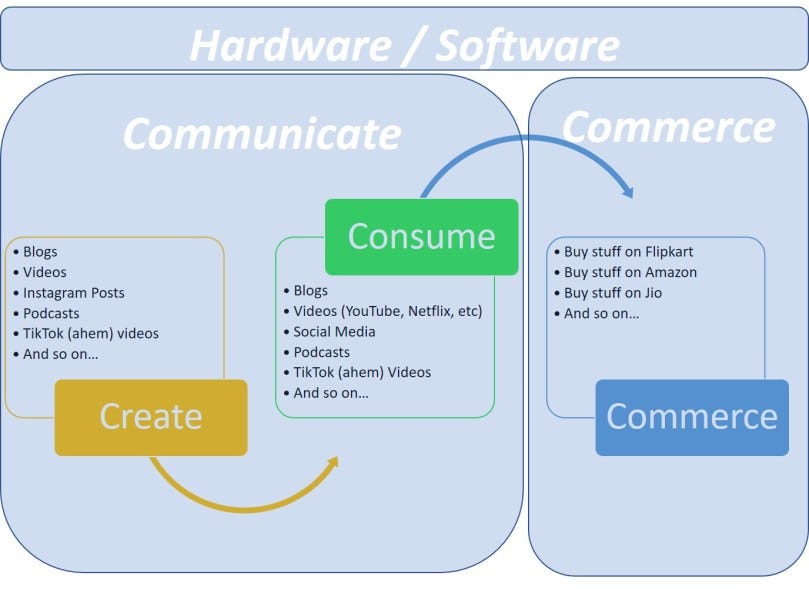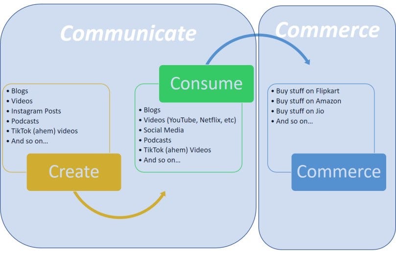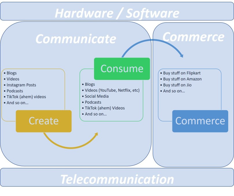 And finally, the reason Jeff and Mukesh are as rich as they are: commerce. Online shopping is literally blowing up in front of our eyes in terms of value. Amazon, Flipkart, Nykaa, all of Jio's online shopping, MakeMyTrip, Oyo, Airbnb, Uber, Zomato... the list is endless, and exhausting. That's the third thing you do online. Commerce.