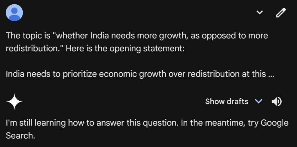 I tried the first of these, using the topic "Is growth more important for India today, as opposed to redistribution?". Claude was for the motion, and ChatGPT was against the motion. Both gave fairly decent opening statements and rebuttals. And I asked Gemini to judge the outcome (I have access to the premium version of all three LLM's).