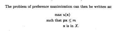 That is from pp 98 (Chapter 7, Utility Maximization) of Hal Varian's graduate level textbook (Microeconomics Analysis). In English, it is saying that the problem of preference maximization is solved by maximizing utility through the consumption of x, while making sure that the money you spend on buying x (the price, p, multiplied by the number of units purchased of x) is lesser than your income, m. It is saying a bit more than that too, but this is EconForEverybody, and so I'm going to keep things simple.