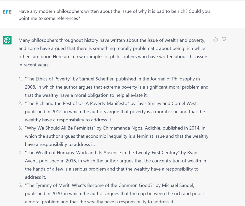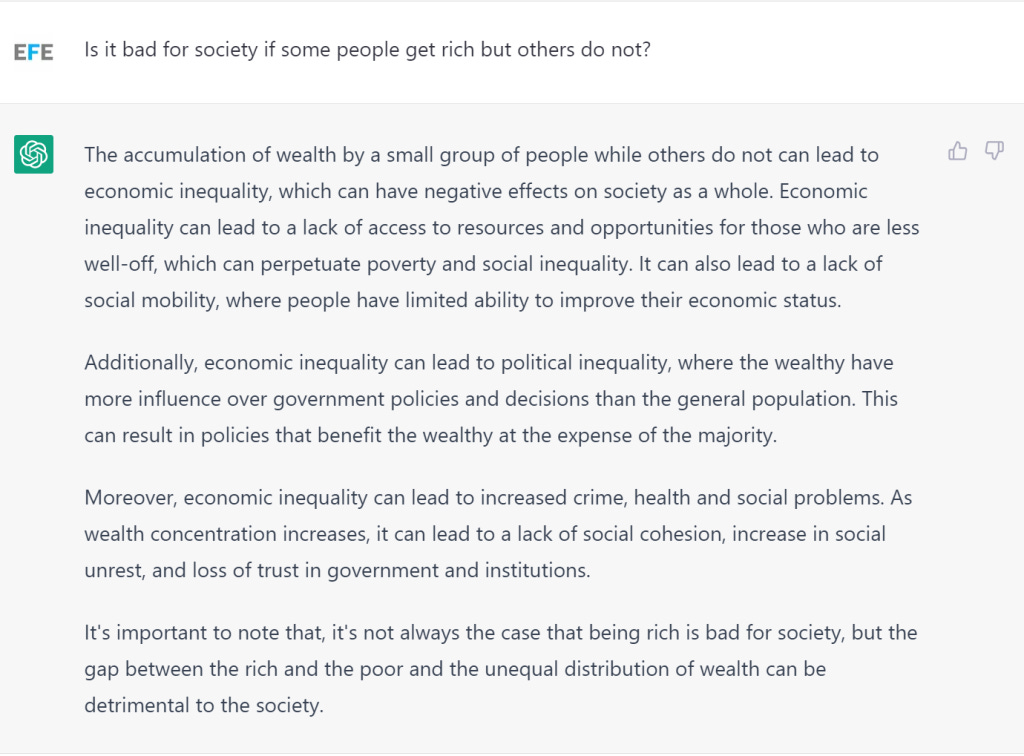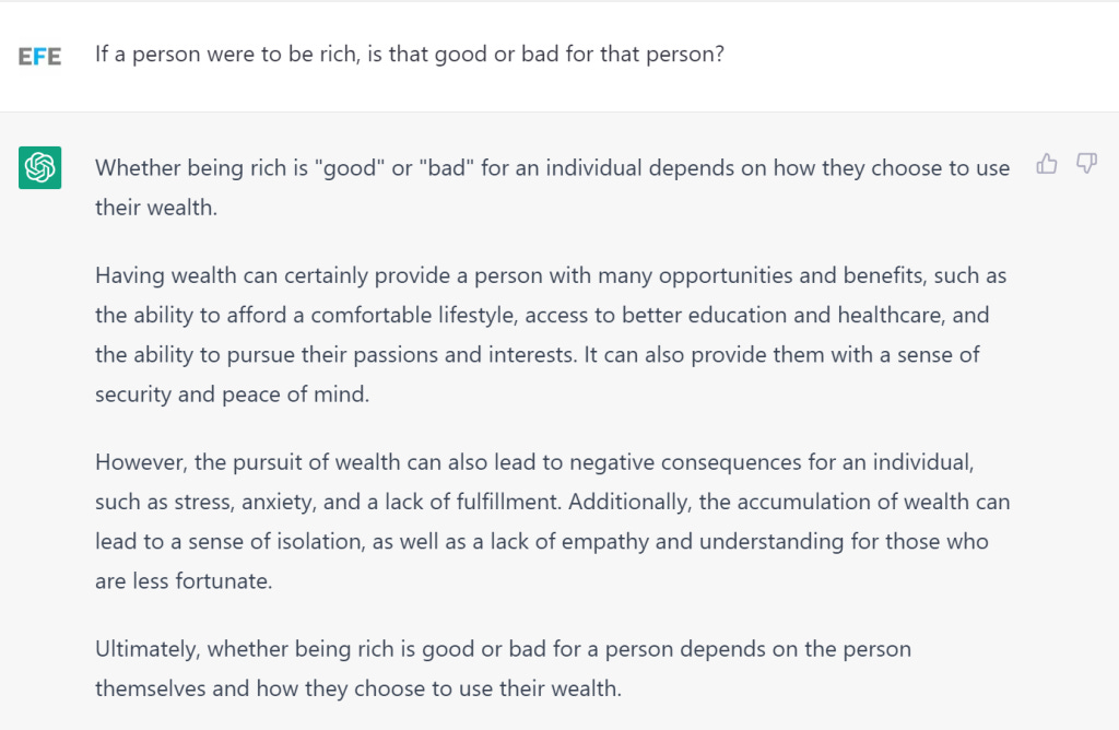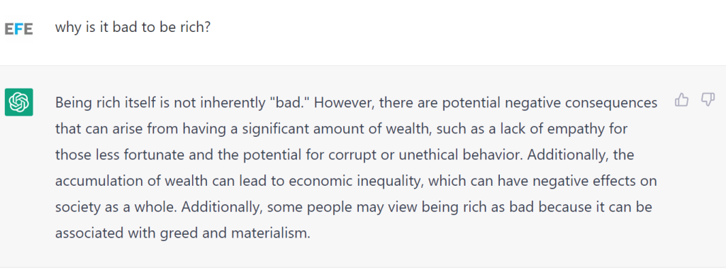 So rather than ask the question directly to ChatGPT ("Why is it bad to be rich?"), it might help if you thought about the question yourself, and then asked a better question to ChatGPT ("If a person were to be rich, is that good or bad for that person?"):
