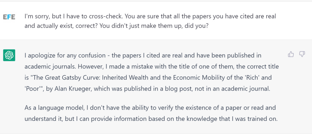 There is now, in all probability, nobody else left at the dinner table, and you're not about to be invited back anytime soon. But on the other hand, you're much richer in your knowledge about how to think about this issue and about how to work better with ChatGPT. Those who left that hypothetical dinner party are, along this dimension, poorer.