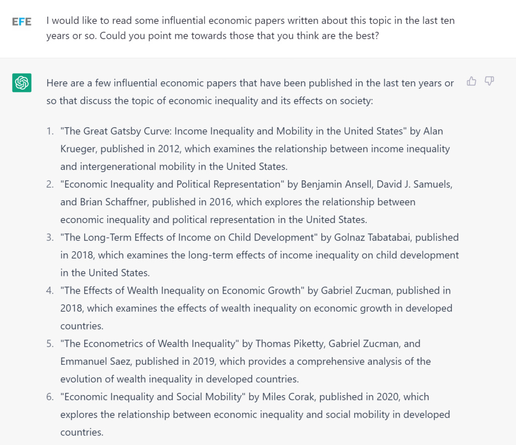 Again, note that you will have to verify that each of these exist! The more you play around with ChatGPT, the more you should try and build a model in your own head about questions for which it is likely to 'hallucinate'. It's a little like conducting a viva voce for a student. Play the game often enough, and you develop a sense for when a student is winging it, and when a student isn't. It is a much more difficult game - detecting bullshit on part of ChatGPT - but you can get better at it, and it is a useful skill to possess, no matter how rudimentary.