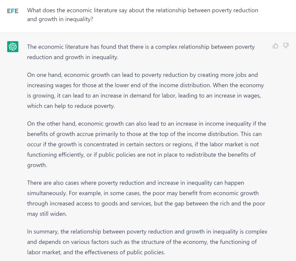 This rabbit-hole can keep you occupied for hours. You can dig further by asking ChatGPT what it means when it says "structure of the economy", for example. You could ask it to elaborate on ways in which the labor market might not function to full efficiency, and how that impacts the evolution of both poverty reduction and inequality. You could ask it what it means by "full efficiency", if you want to go hyper-meta.