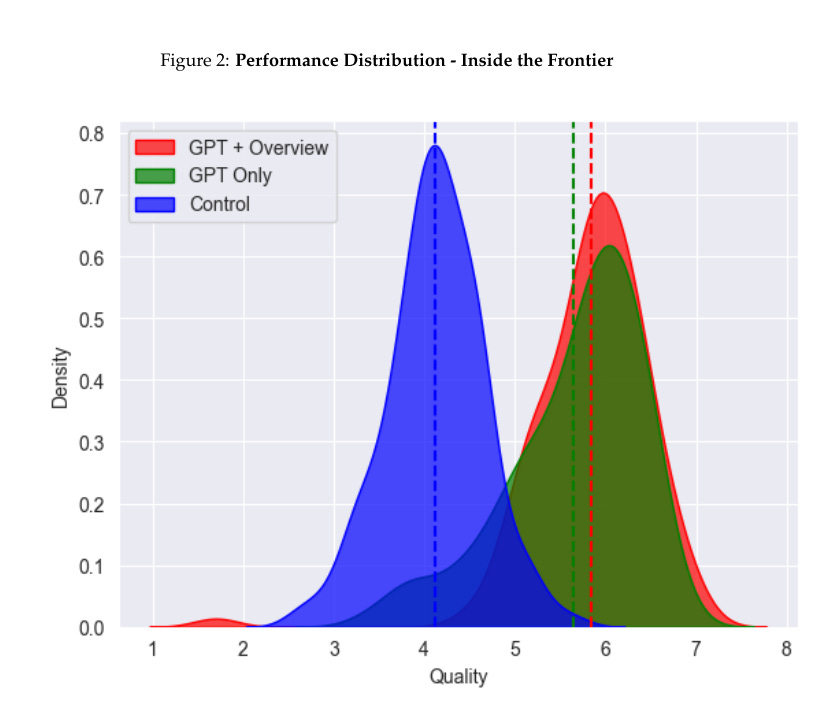 "Our results reveal significant effects, underscoring the prowess of AI even in tasks traditionally executed by highly skilled and well-compensated professionals. Not only did the use of AI lead to an increase in the number of subtasks completed by an average of 12.5%, but it also enhanced the quality of the responses by an average of more than 40%. These effects support the view that for tasks that are clearly within its frontier of capabilities, even those that historically demanded intensive human interaction, AI support provides huge performance benefits." (pg 12)The "outside the frontier" task: