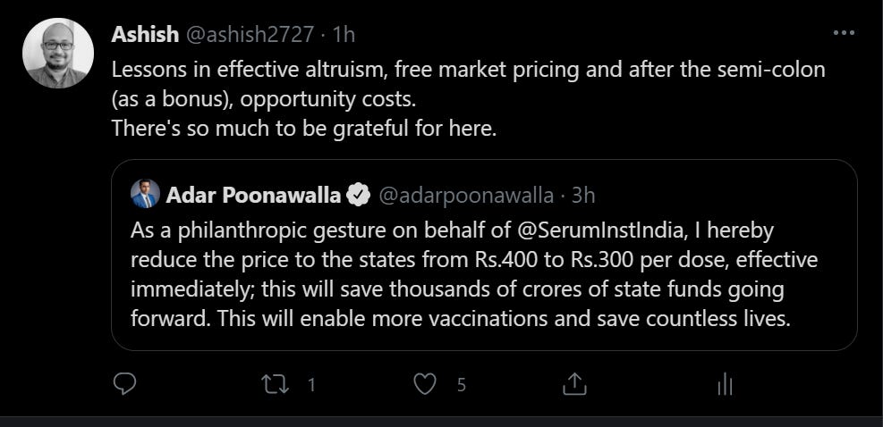 If it is the first point above, us economists must explain why we think it is ok for those 100 rupees (per dose) to go into SII's coffers.