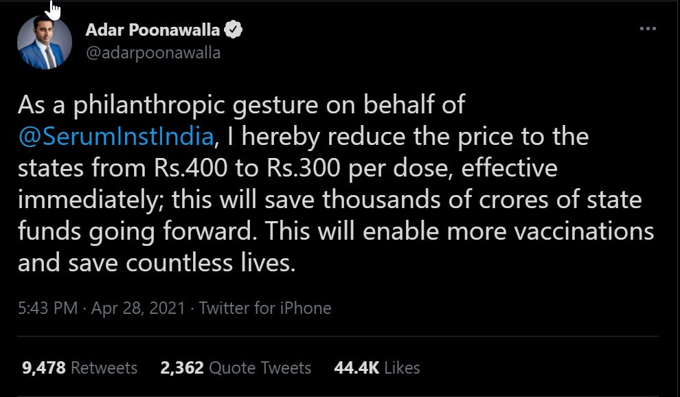 If we assume that he was going to earn an extra 100 rupees per vaccine sold, and that he was going to sell say 200 million vaccines to the states, that's 200 million into 100 rupees.((Where do I get that number 200 million from? Who knows? I assumed that for the 960 million people in total who become/continue to be eligible on the 1st of May, he gets to sell only 200 million doses to the states. And yes, I am assuming only a single dose for these 200 million. Since nobody knows what the quantities are actually going to be, this is as reasonable an assumption as any other. If anything, this is a very conservative estimate. No?))