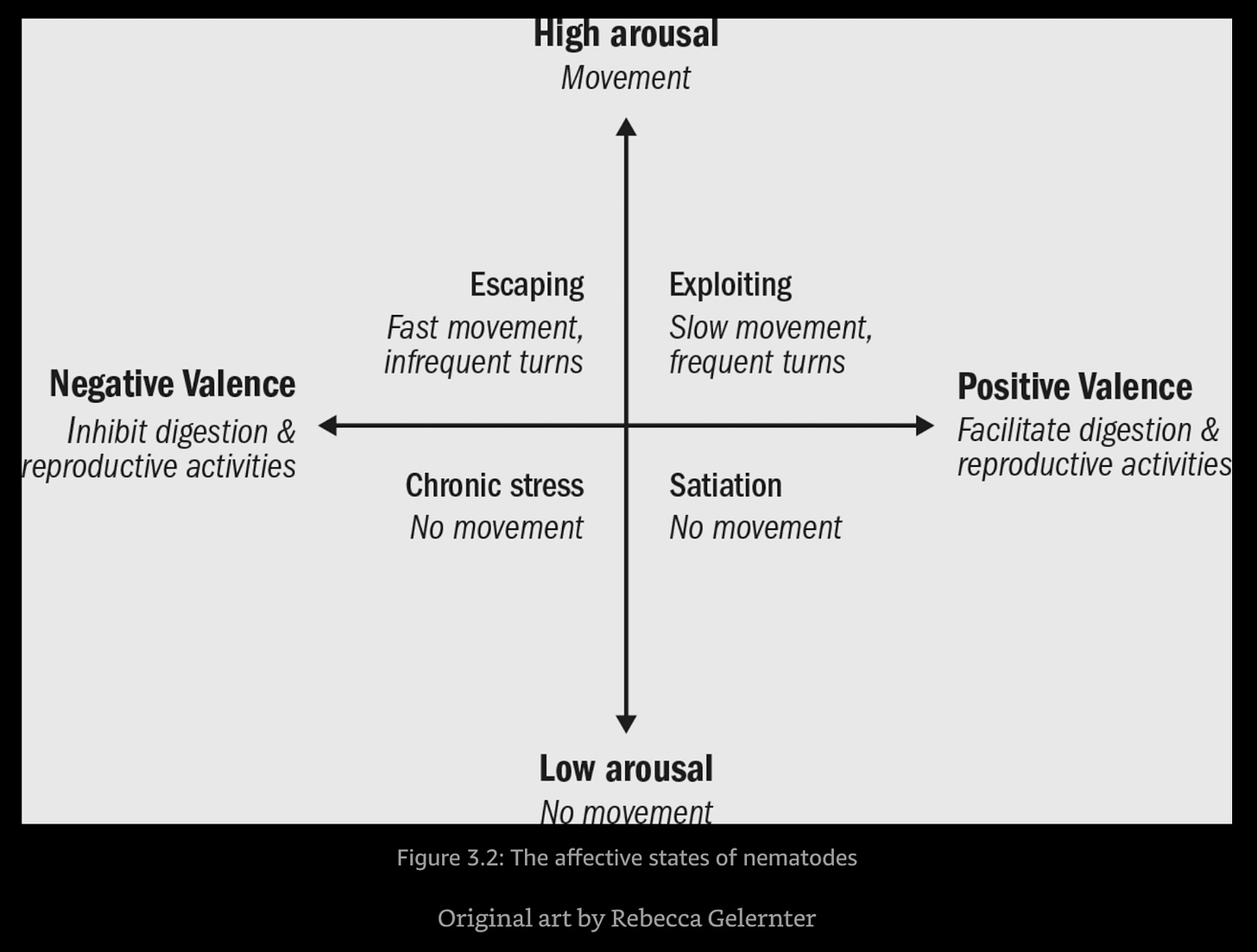 Max Bennett has the answer in a nice little book called A Brief History of Intelligence: Why the Evolution of the Brain Holds the Key to the Future of AI. The earliest form of biological intelligences (nematodes), were able to move towards places that facilitated digestion and reproduction (positive valence), and away from places that hindered these two processes (negative valence). They were likelier to move when in a state of hunger ( high arousal), and less likely to move when highly satiated (low arousal).