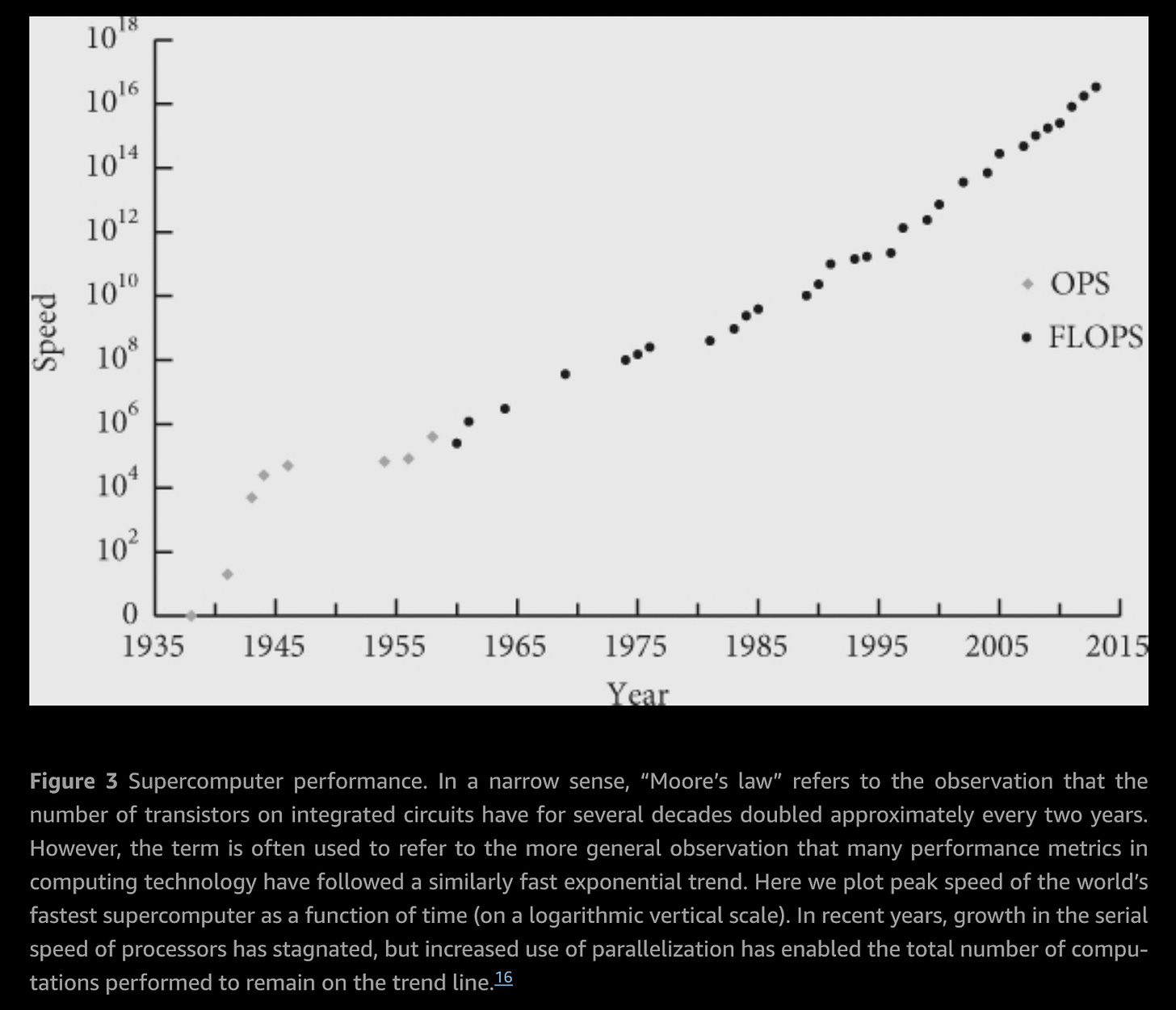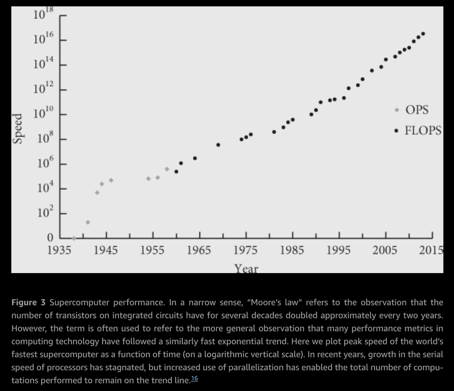 That chart is from a book called Superintelligence, written by a guy called Nick Bostrom. That chart might not look all that impressive until you realize that the vertical axis is a log scale. Supercomputers have been getting a 100 times better every decade for the last eight decades. That trend hasn’t petered out, and note that this chart ends in 2015 (which is when that book was written).