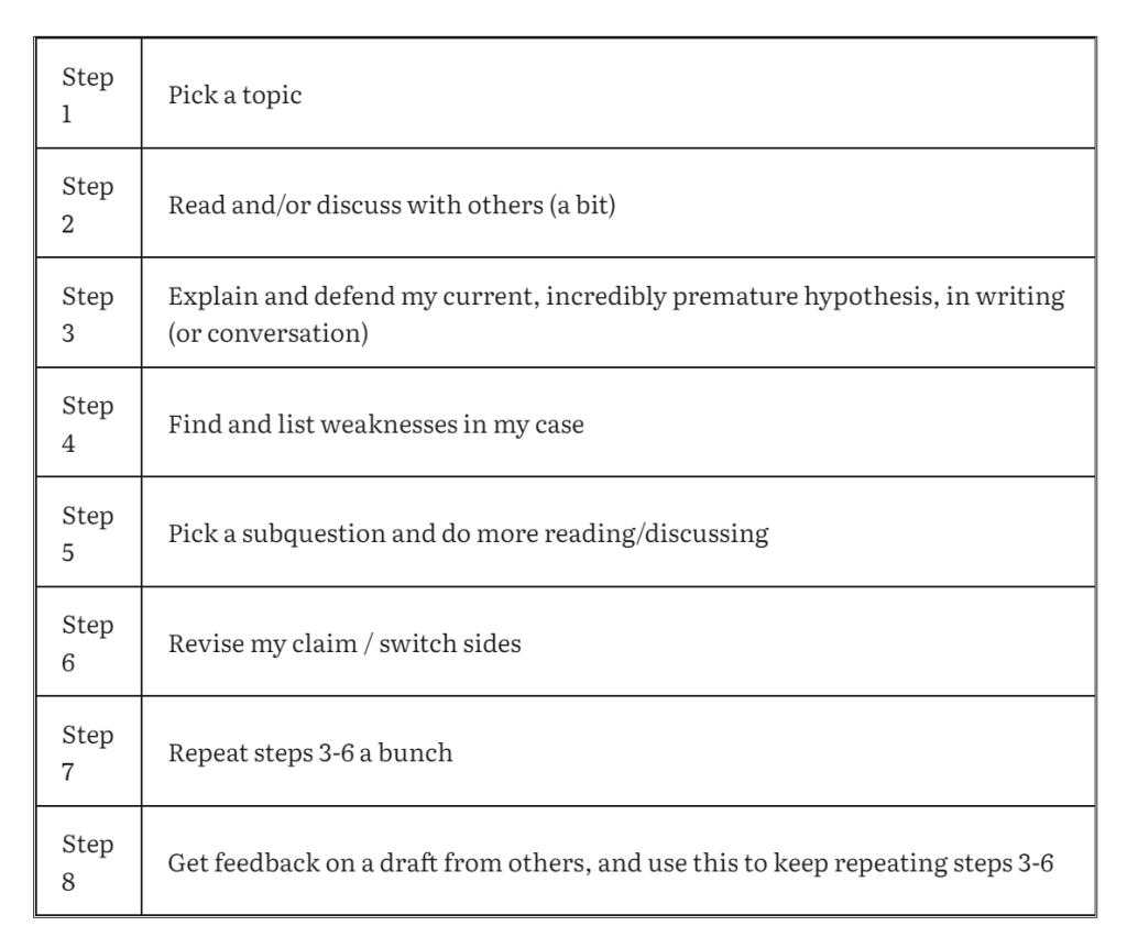 I usually start by trying to read the most prominent 1-3 pieces that (a) defend the claim or (b) attack the claim or (c) set out to comprehensively review the evidence on both sides. I try to understand the major reasons they’re giving for the side they come down on. I also chat about the topic with people who know more about it than I do, and who aren’t too high-stakes to chat with.