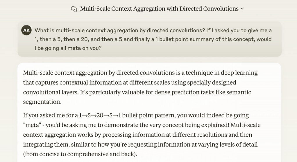 What made me happiest about my prompt is the fact that applying this prompt to "multi-scale context aggregation by directed convolutions" was a very gratifying exercise. Having read the output that 01 gave me, I went and asked Claude 3.7 a follow-up question: