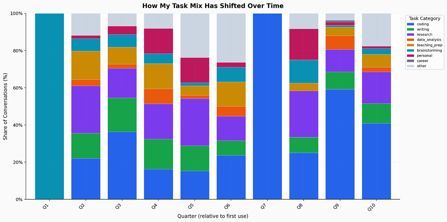 Task diversification mirrors the aggregate pattern, but more dramatically. My earliest quarter was almost entirely brainstorming. By my most recent quarters, I have seven or eight categories with a meaningful share in each category: coding, writing, research, data analysis, teaching preparation, and more.