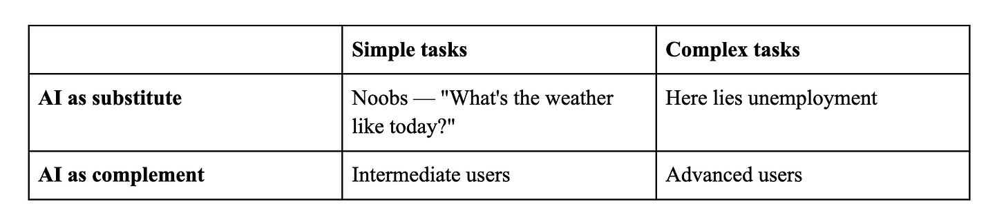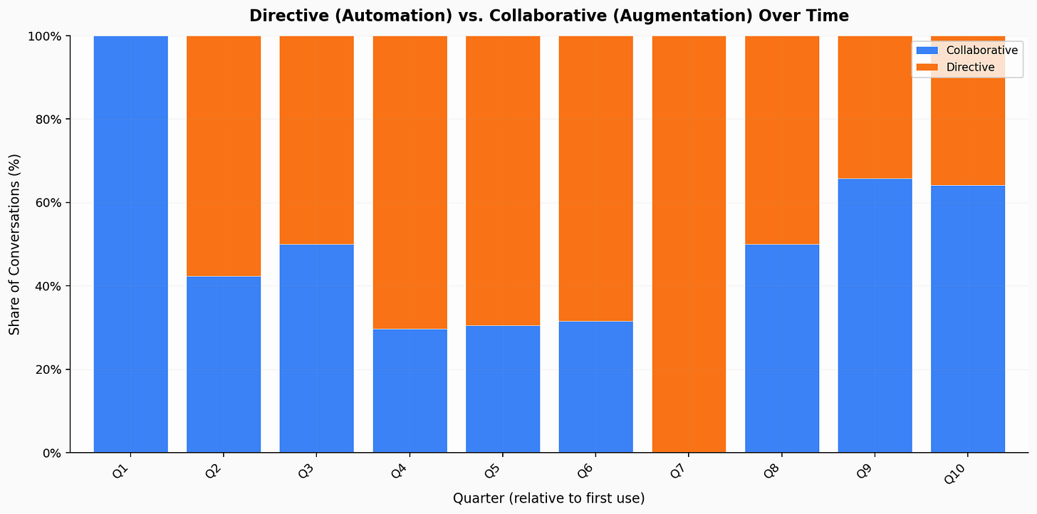 New users treat AI as a substitute for simple tasks, say as a better Google search. Intermediate and advanced users learn to treat it as a complement for complex work. The danger zone is when people start using AI as a substitute for complex tasks, delegating without understanding. This is what we should watch for. So far, the data is reassuring: advanced users collaborate more, not less. But that could change as models become more capable.