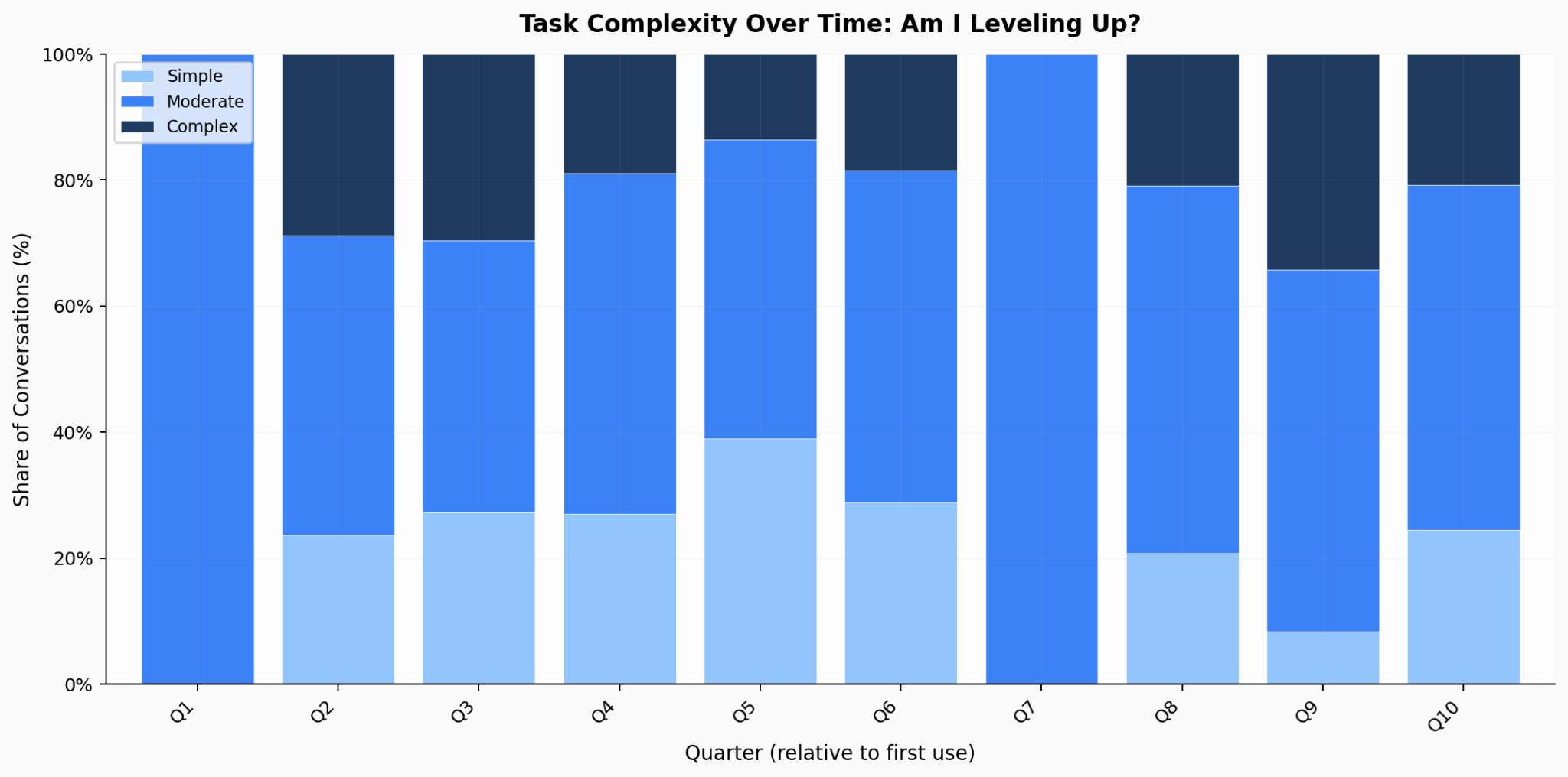 77% of my conversations are moderate-to-complex. Only 5% are personal. Against the report’s finding that new users devote 42% to personal use, this is a stark contrast.