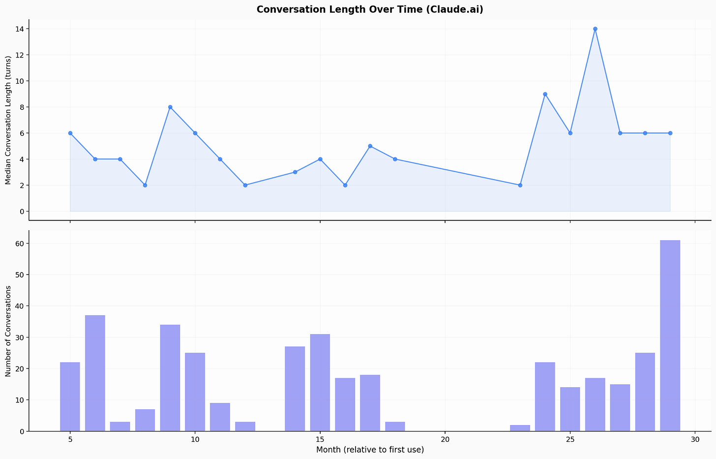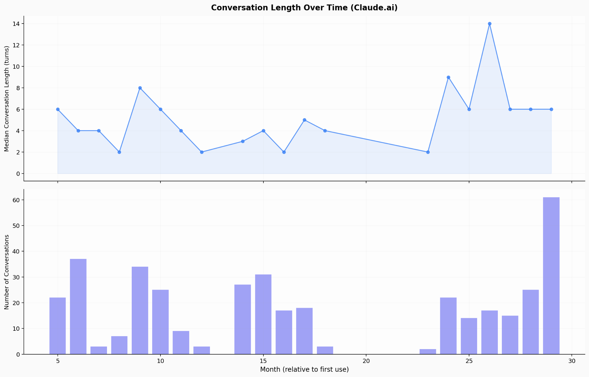 And my conversation length is increasing, not plateauing. Median turns per conversation have spiked in recent months (9–14 turns).