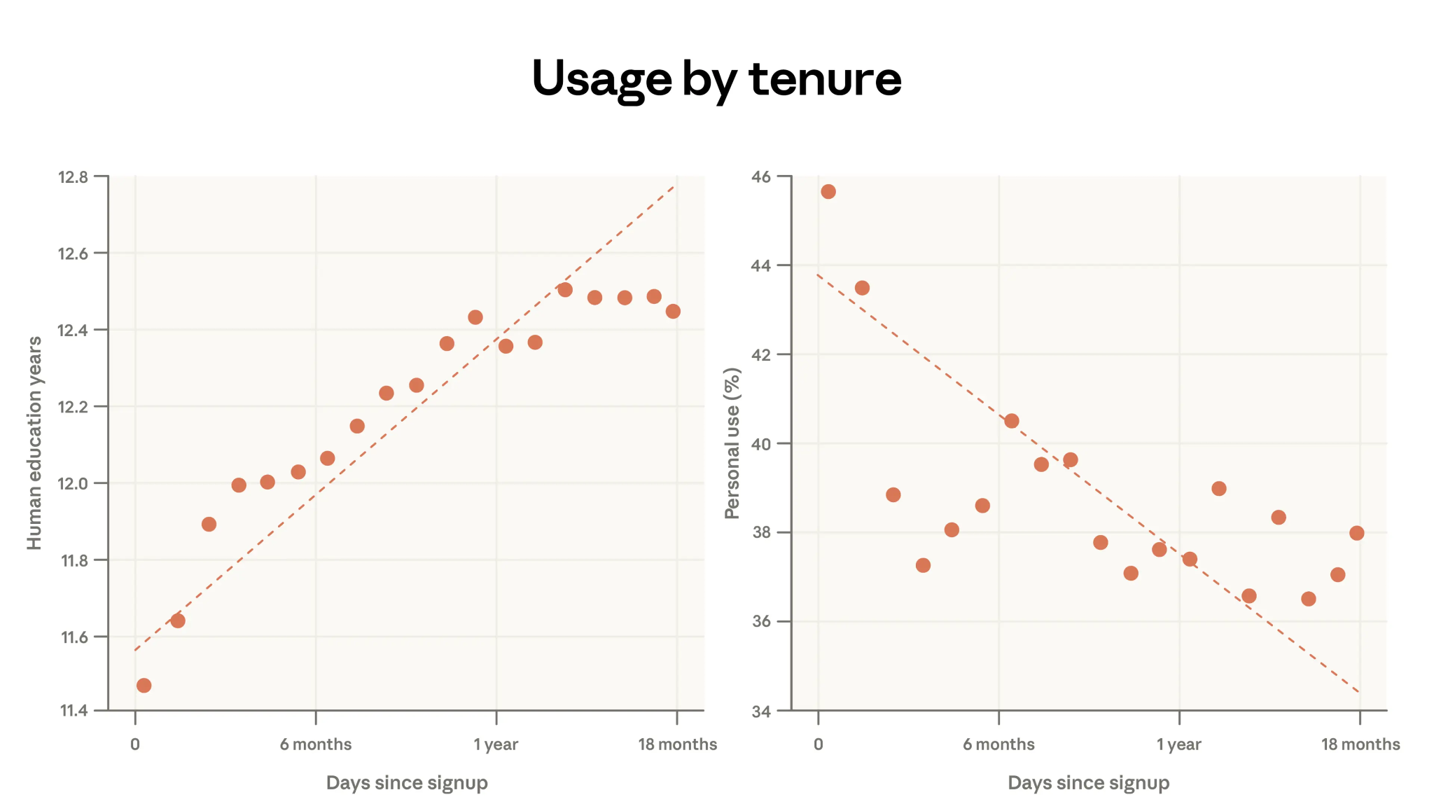 The data shows that the years of education needed to understand user prompts increases by almost 1 year for every additional year of Claude usage. That is Very Good News, because it shows that users are getting better at using these tools. But the relationship appears to taper off after roughly a year of use.