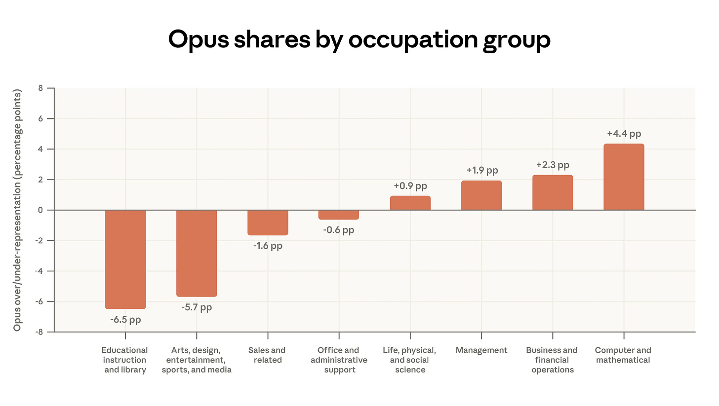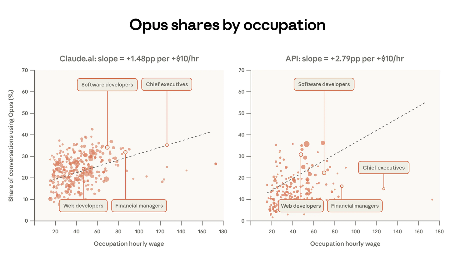 I think this finding is slightly open to misinterpretation if read as “higher-paid professionals use Opus more.” What it really shows is that people pick the more powerful model when the specific task demands it. A software developer may pick Opus because a particular problem demands the best reasoning available. An academic, by contrast, may pick Sonnet. Why? Because the per-conversation (per task, to use Acemoglu’s framing) cognitive requirement is lower, even though teaching itself as a whole is complex work.