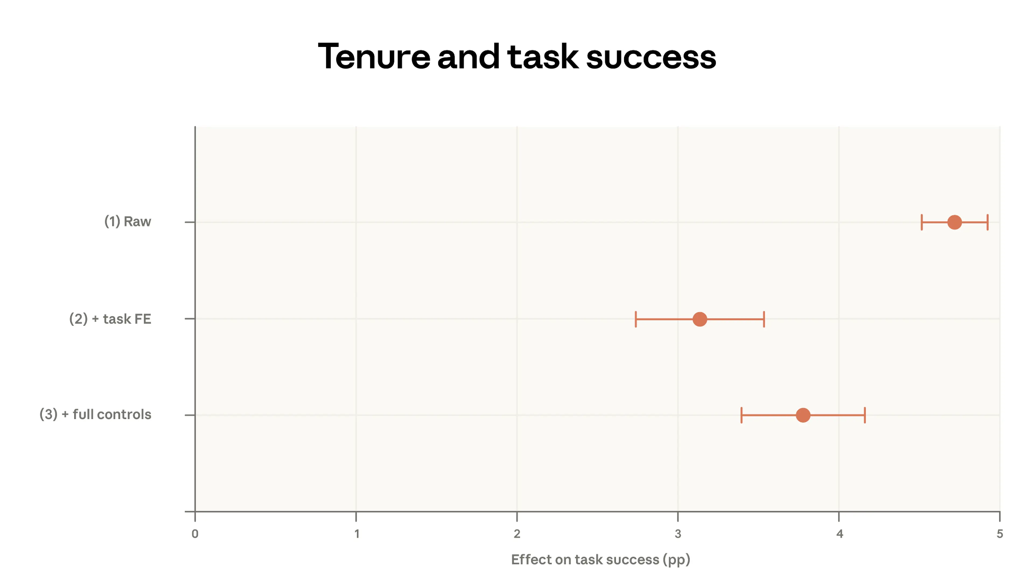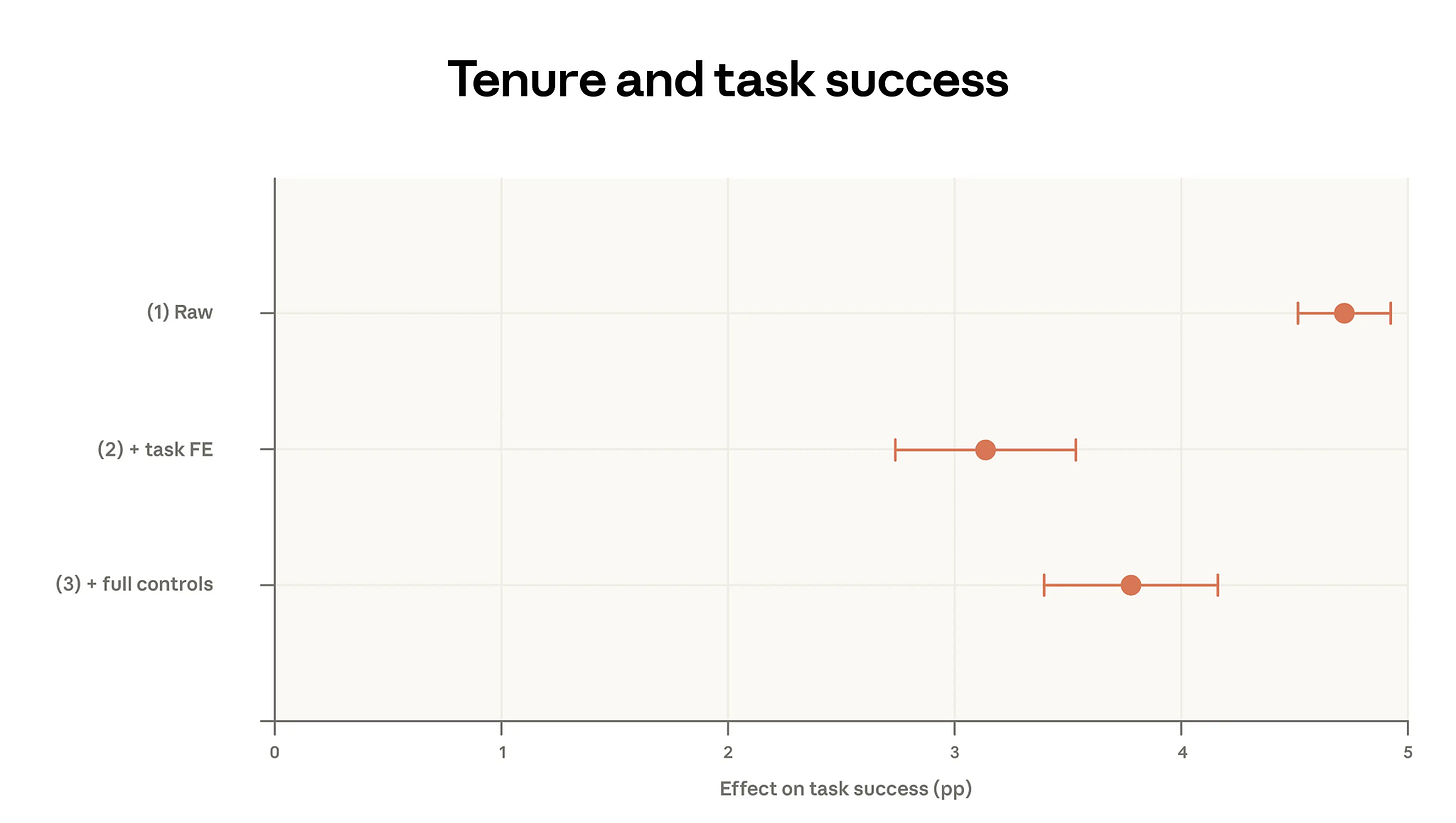 That last number is important. And it survives increasingly stringent controls. When you compare high- and low-tenure users doing the exact same task (using task fixed effects), the gap shrinks to about 3 percentage points. When you add controls for model choice, language, country, and use case, it moves back up to about 4 percentage points. That’s what the chart below is showing you.