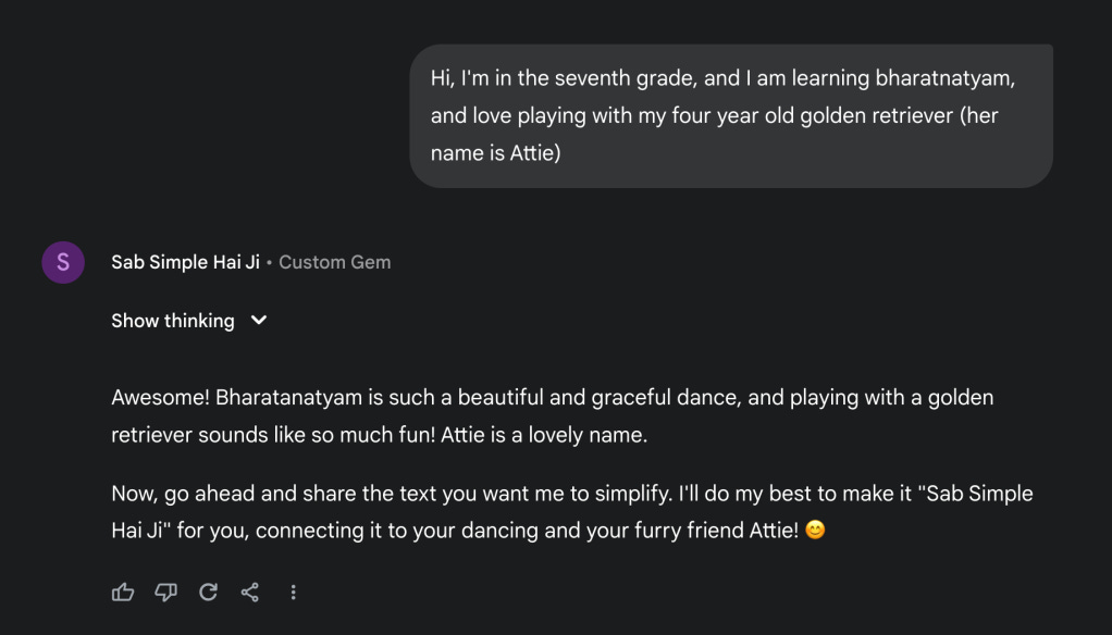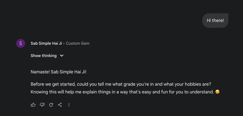 Note how I have added in that bit about the hobbies in addition to asking about the grade - you absolutely can (and should) tweak the prompt to suit your needs, and you are only constrained by your imagination. You can ask for explanations written as rap song lyrics, or as a fairy tale, or any other customization that you can come up with. Your Gem should suit your requirements!