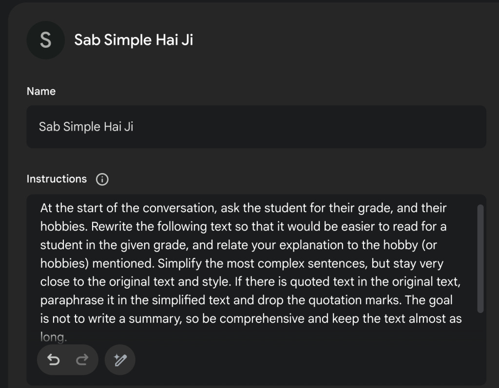 Let's say you want to build a Gem that "can rewrite provided text so that the content and language better match instructional expectations for students in a particular grade, while preserving the original style and tone of the text." That is, say you'd like your daughter, who is in the seventh grade, to be able to understand just what on earth academic papers from the field of economics are saying.