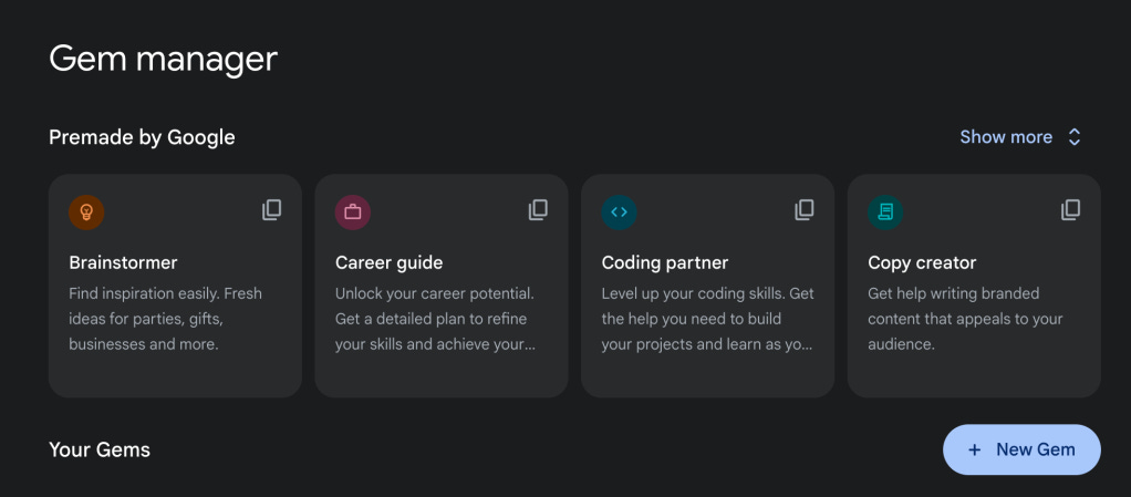 Have you been to one of those yoghurt bars, those places where you get a serving of yoghurt, and you can then add in as many toppings and flavorings as you like? A Gem (and the Claude and chatGPT equivalents) are something like that. You get the base model, and you can then customize it as you like.