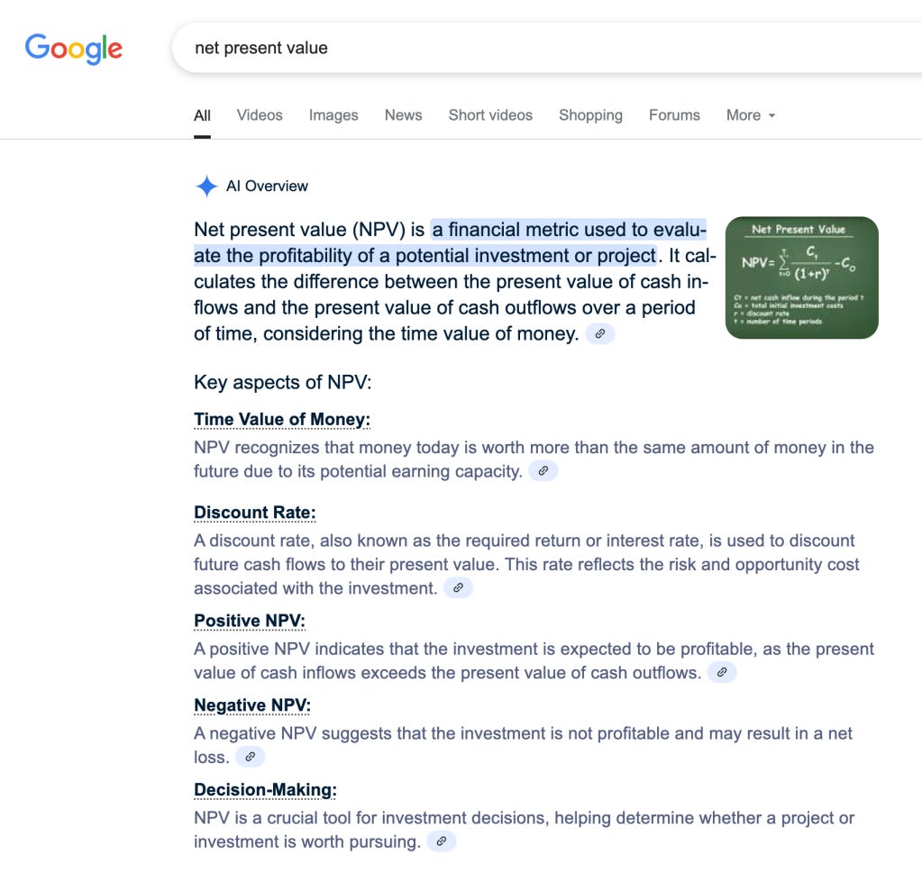 How to test if it is working "well"? I just searched online for "NPV", and shared the screenshot below with my custom Gem:
