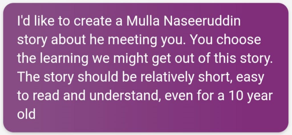 The other day, there was a conversation on a Whatsapp group that I am privileged to be a part of, where we got to wondering if AI can be capable of being humorous. Could it tell, for example, a Mullah Naseeruddin story? There was one easy way to find out!