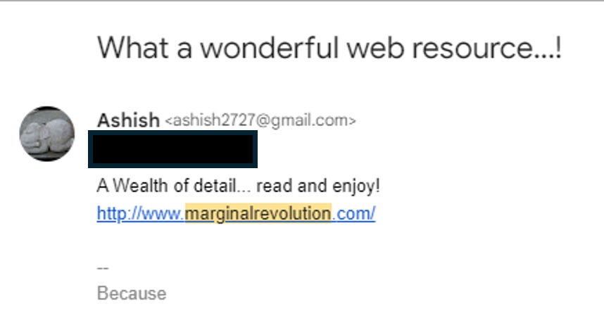That is an email I had sent to two of my friends, back in February of 2006. I'm sure Marginal Revolution must have been called plenty of things over the last twenty years, but "web resource"? Surely a record of sorts.
