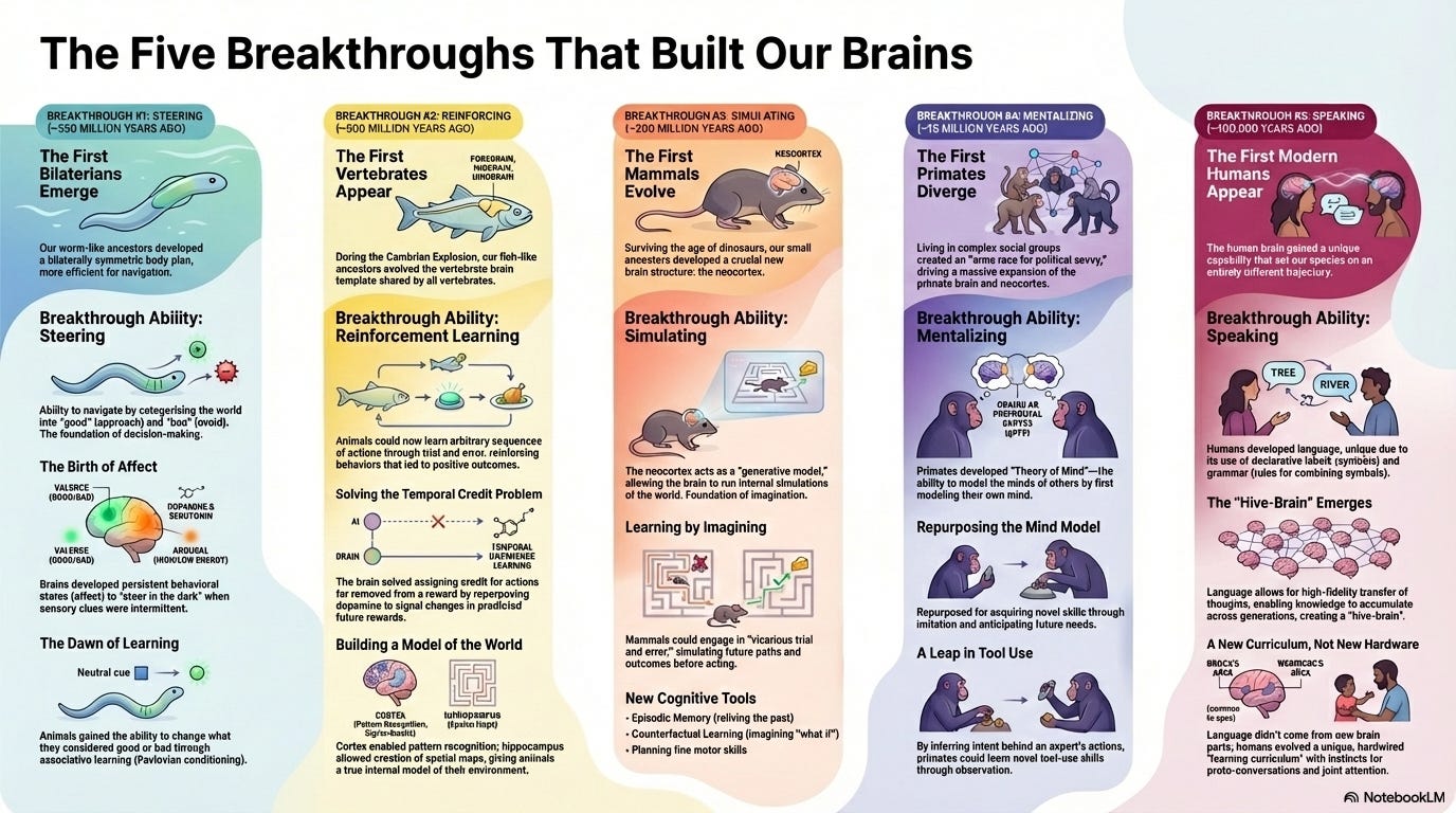 S-R-S-M-S. That’s how I remember the five stages shown here1. That’s Steering, Reinforcing, Simulating, Mentalizing and Speaking. Those, Max Bennett says, are the five stages of organisms developing intelligence on this planet.2