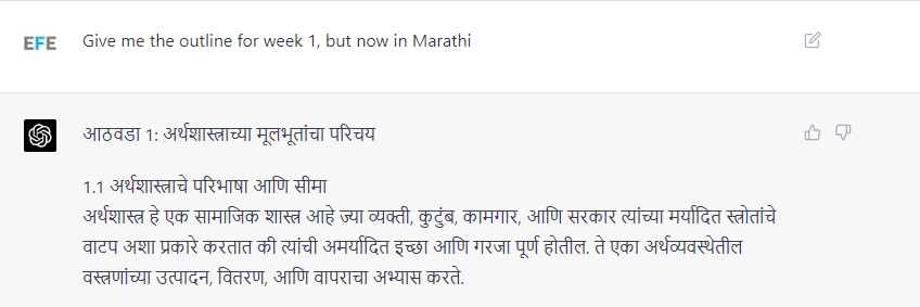 So, does this put me out of my favorite job? Not yet, in my opinion, but the day isn't far off. But rather than feel sorry for myself, I feel excited about this! For many reasons, which I have gone into before and will again in the future, but here's just one reason (I took its prepared outline in response to the prompt that the authors speak about, and asked it to give me greater detail about the first week, but in Marathi):