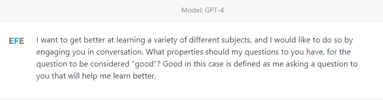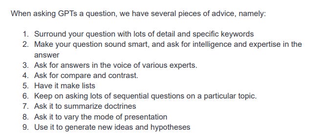 Cool, you might say, and a very interesting answer, but what's the point? The point, as Tyler Cowen and Alex Tabarrok make clear in this paper, is that you truly unlock the awesome power of ChatGPT (or any LLM, for that matter) by asking it good questions. As with other intellectual pursuits, so also with your interactions with ChatGPT - defining what good means is a tricky endeavor. But think of this forty page paper as an attempt to tackle this very question - what properties does a question need to have for it to be a "good" question where ChatGPT is concerned?
