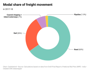 Currently, we transport about 4.6 billion tonnes of goods worth 9.5 lakh crore rupees every year, and we do that through three different ways: coastal freight, road freight and rail freight. I got these statistics from a recent report on the Capitalmind website: