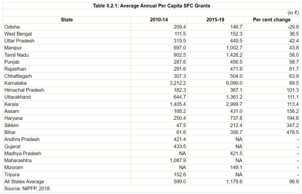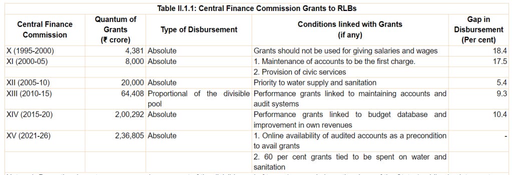 The good news is that over the last six central finance commissions, the quantum of grants has been consistently going up (that's the second column). But on the other hand, the gap in disbursement remains worryingly high (that's the fourth column).