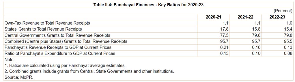 Finances of Panchayati Raj Institutions (PRIs) face constraints in that they have limited own revenues from property taxes, fees, and fines. Nearly all of their revenues are generated through grants from higher levels of government, underscoring their heavy reliance on the Central and State governments. Even as grants-in-aid from the upper tiers of government have aimed at mitigating horizontal disparities, the large dependence on grants can affect their financial self-reliance, limiting their ability to decide on local spending and priorities independently. Such dependence also lessens their drive to establish independent revenue streams. For sustainable growth, Panchayats need to intensify their efforts to augment their own tax and non-tax revenue resources and improve their governance. Nevertheless, the prompt establishment of State Finance Commissions (SFCs), eschewing the sizeable delays that occur currently, assumes importance. SFCs, with roles identical to those of the Central Finance Commission (CFC), and with the obligation of tabling their action-taken reports in State legislatures, can fortify the financial position of PRIs and help them in better delivery of their responsibilities for upliftment of the rural economy.