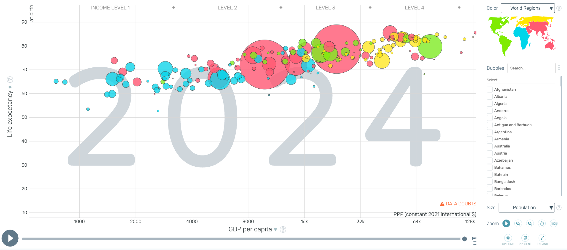 We have income on the horizontal axis, we have life expectancy on the vertical axis. The color of the bubble indicates the region, while the the size of the bubble indicates population. Gapminder is a great way to answer Question 1, by the way.