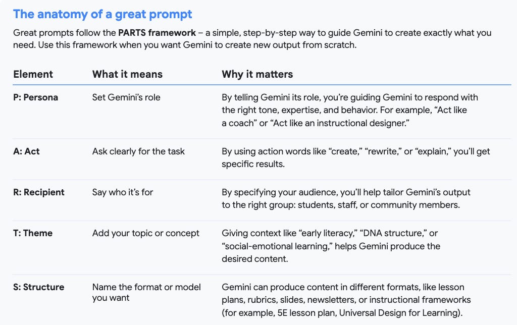 Here's Google's own example of a very good prompt that takes into account the answers to all four of my questions, or the PARTS framework: