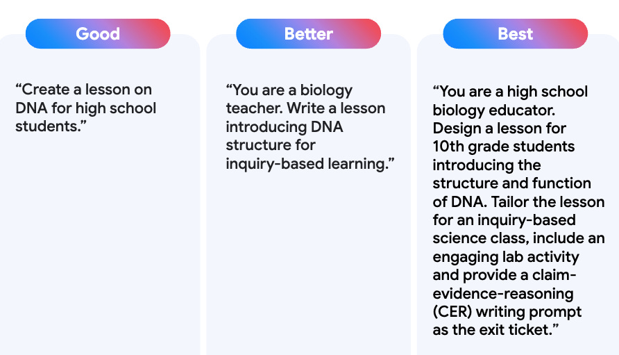 Google gives you three example prompts, shown above, and tells you that the one on the left is good, the one in the middle is better, and the one at the right is best.