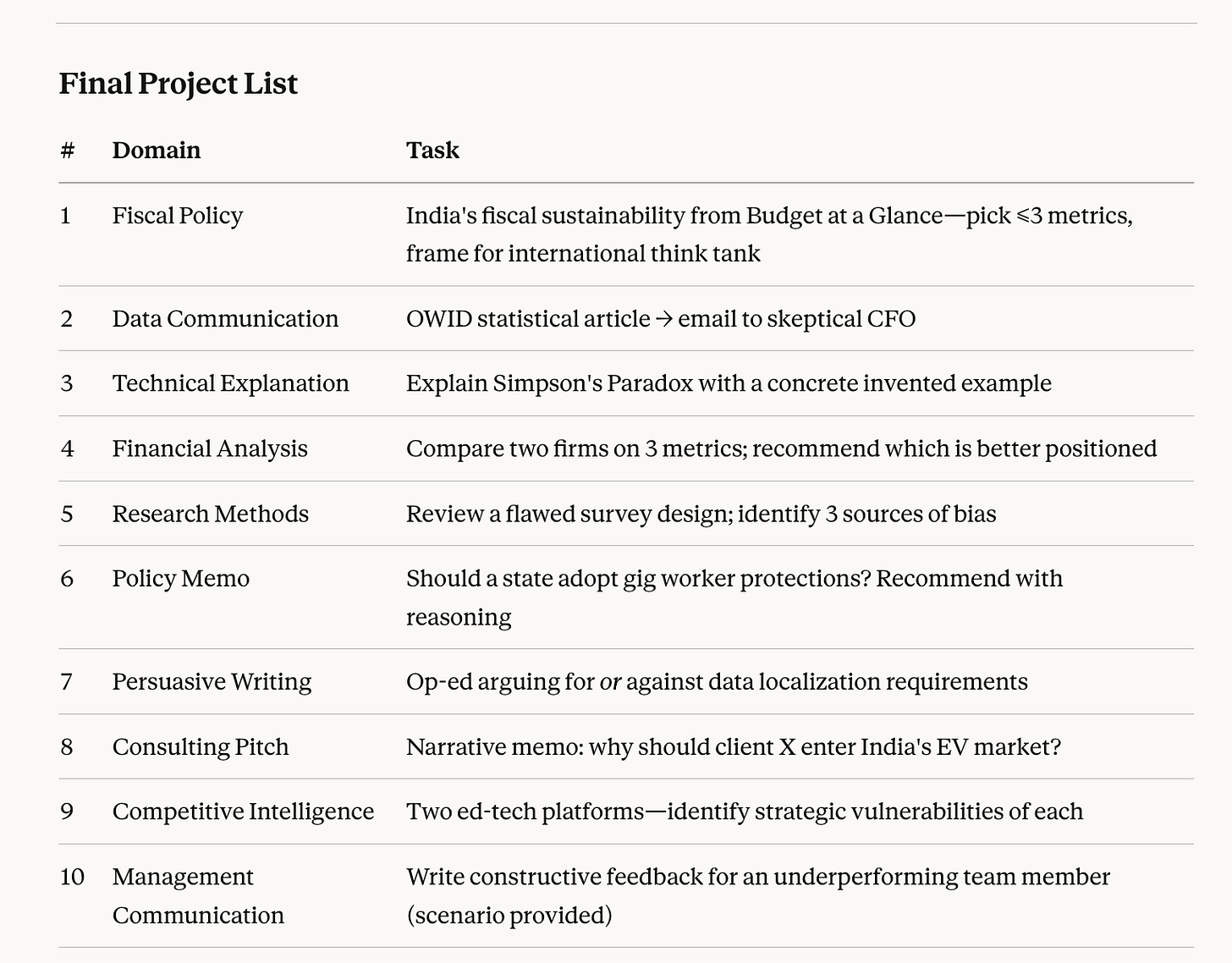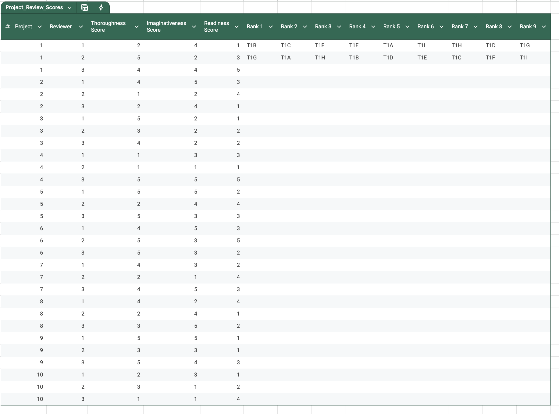 Give each such project folder to three separate reviewers. Each reviewer would be asked to rate each project along, say, three different dimensions. A score of 1 would mean the submission is unusable, while 5 would mean it is perfect. For example, one dimension might be Thoroughness, another might be Imaginativeness, and a third might be Readiness Score. Why three, and why these three? Great question, and both answers can change depending on your needs and preferences. Chat with your friendly neighborhood LLM about this, and feel free to improve upon my suggestion. In fact, I insist that you do so!