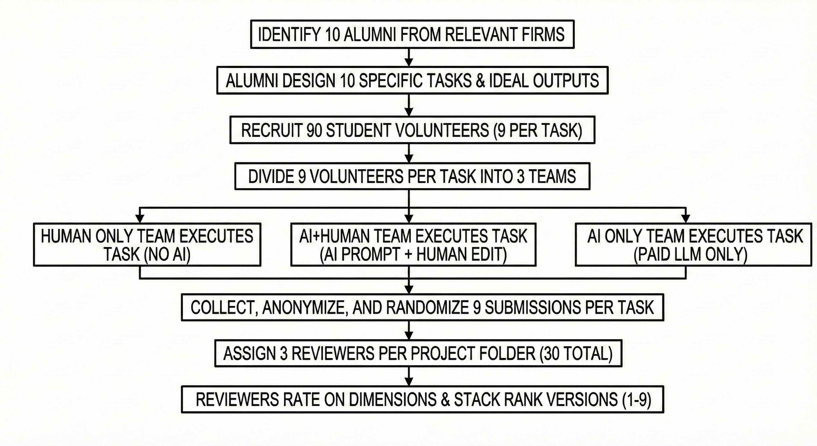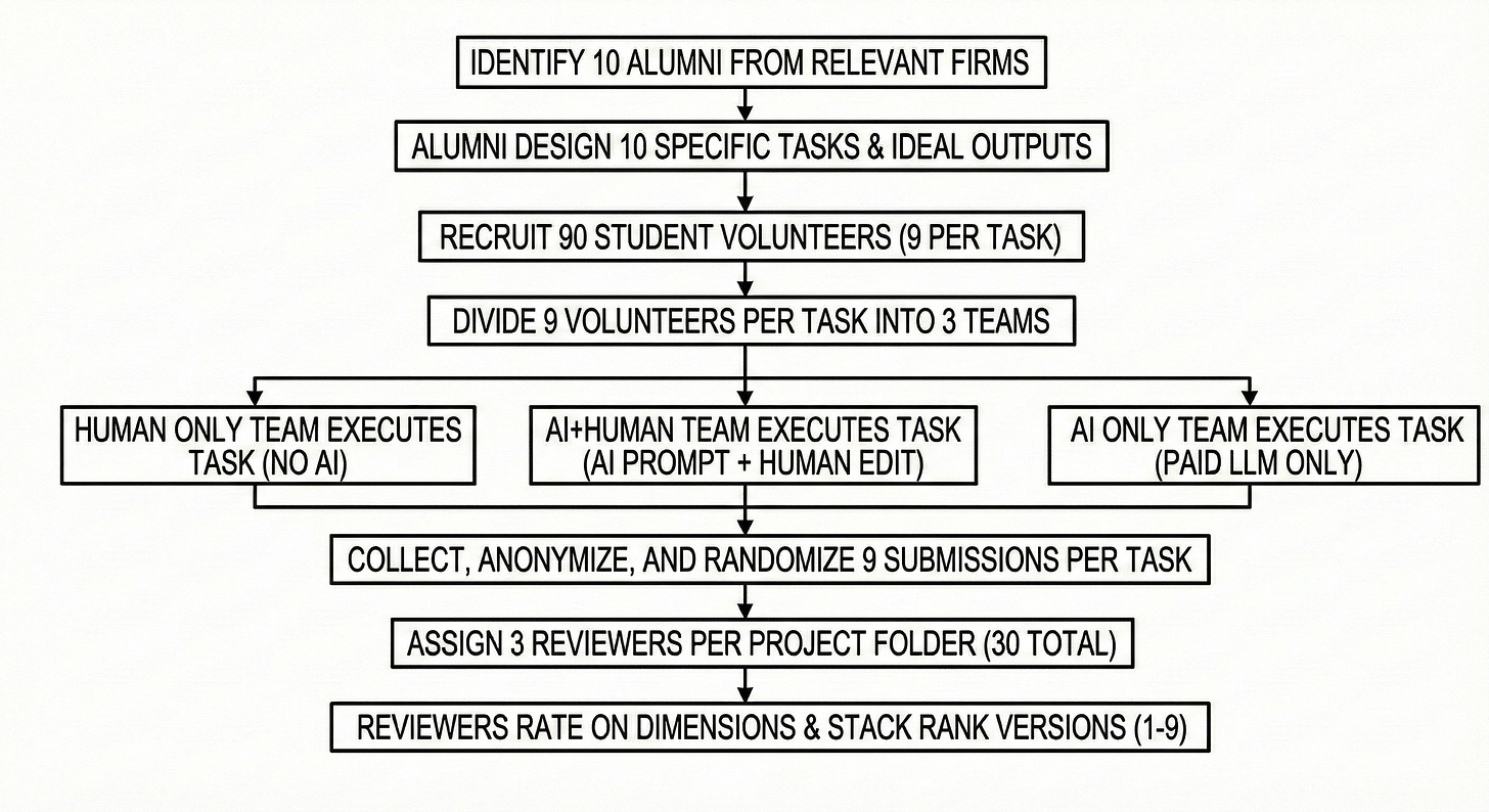 What do we do with these ten tasks? In brief: design tasks, recruit students, split into three arms, anonymize outputs, have alumni review blind, analyze statistically. What you're about to read about is called an eval—a structured way to measure how well a system performs on tasks that matter.