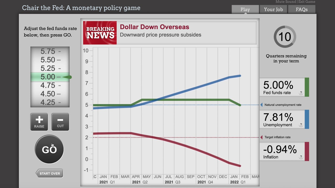 Thank you for your interest in the monetary policy game, Chair the Fed. The game has been a useful and fun tool to learn more about monetary policy. However, the Fed has updated its approach to monetary policy, and the changes are not readily accommodated within the existing structure of the game. As of June 1, 2021, the game is no longer available.