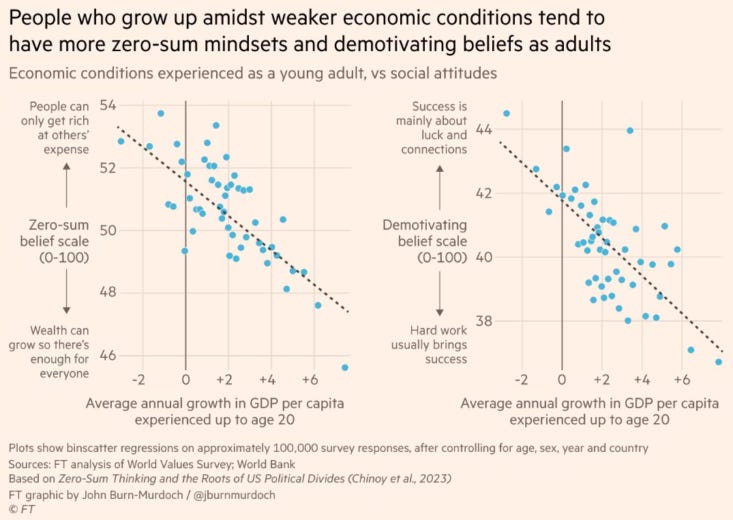Long story short, the lower the GDP growth that you experience up to age 20, the more likely that you will have a zero-sum mindset.