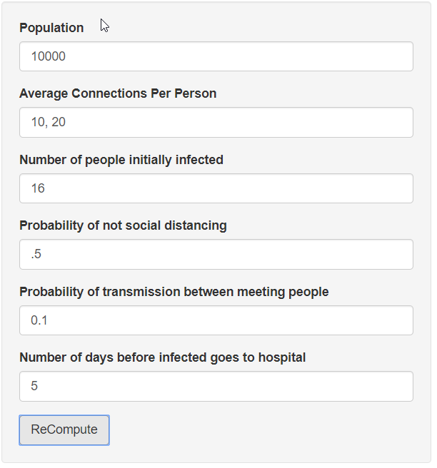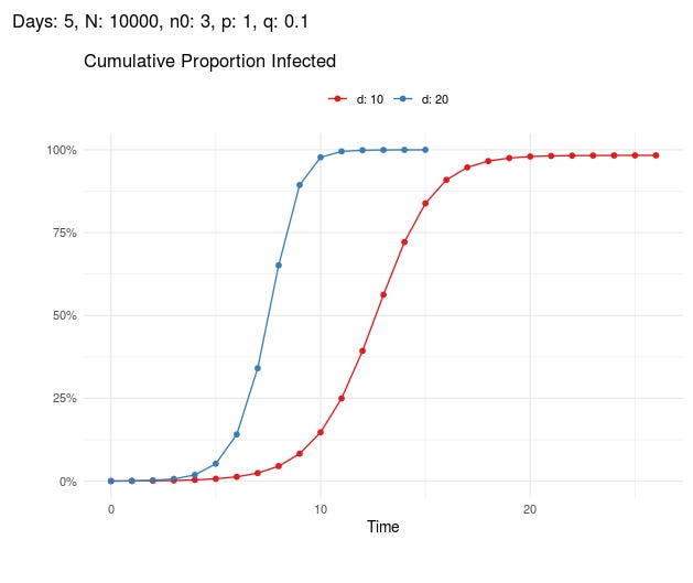 For the scenario outlined above, it takes about 10 days for 100% of the population to get infected with the virus, assuming the average connections per individual are 20.