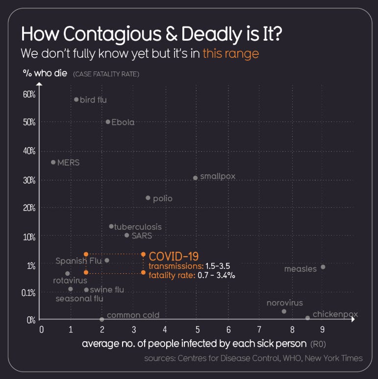 Chicken pox is irritating, because it spreads quickly. But the good news is it is essentially never going to kill anybody. Bird flu is dangerous, because it kills a lot of people. But the good news is that it doesn't spread to a whole lot of people.