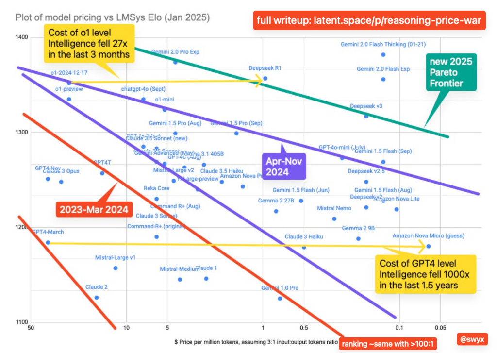 The horizontal axis shows you price per million tokens, but the price gets cheaper as you move from left to right. The vertical axis shows you performance capabilities, as measured on LMSys Elo. Higher is better.