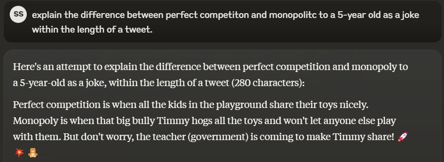 I will not ask Claude/ChatGPT/Gemini to help me draft my tweet length microecon theory joke for a five year old.